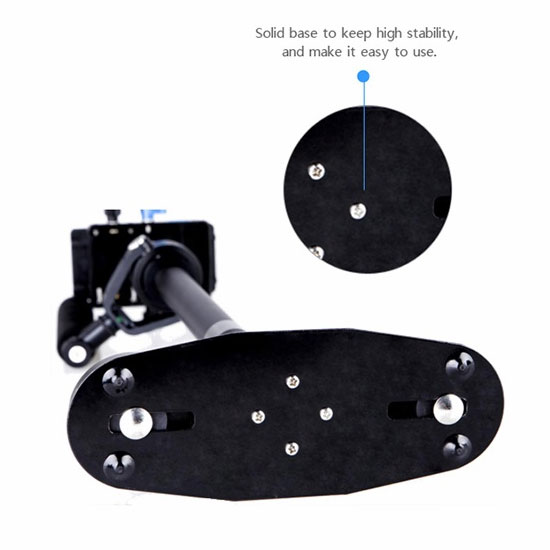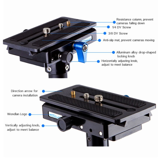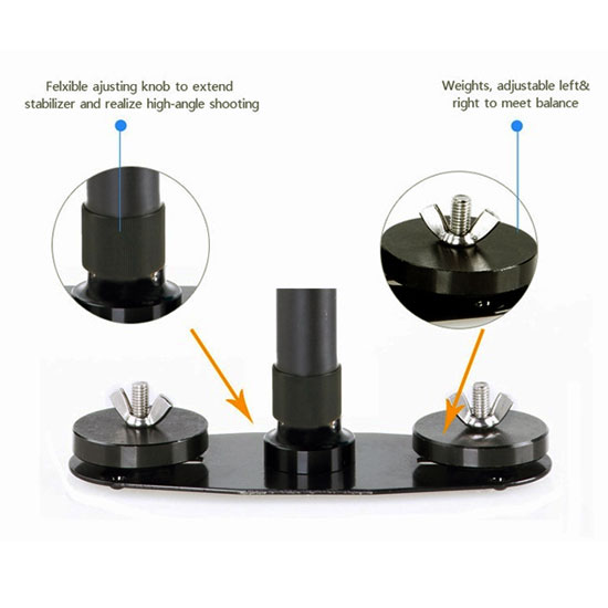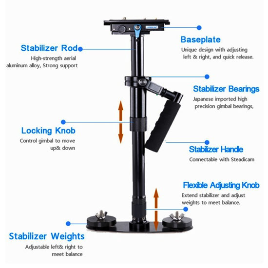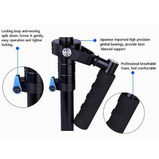 Stabilizer kamera ini memiliki berat 1.2 kg dan tinggi maksimal 710mm serta mampu memuat beban hingga 3 kg, sangat cocok untuk untuk DSLR Kamera, Digital Camera dan Camcorders.