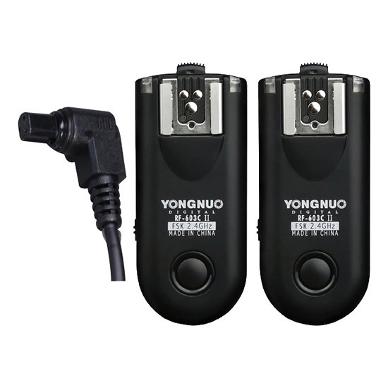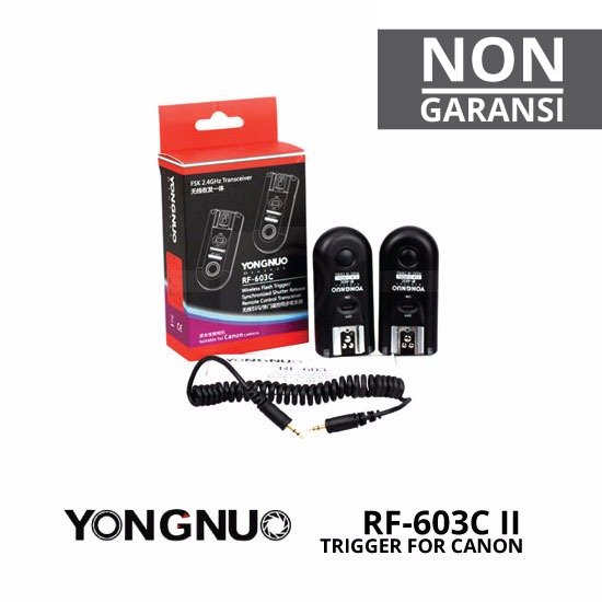Yongnuo RF-603C II Trigger Canon ini memiliki dua 16 channel, transceiver 2,4 GHz serta kabel shutter release untuk remote triggering kamera Canon. Setiap transceiver memiliki male kamera shoe di bagian bawah serta female hot shoe di atas untuk triggering unit flash. Sistem ini memiliki wireless range 100 meter dan bisa sync dengan kecepatan hingga 1/320 detik. Selain itu, trigger juga memiliki dual-function shutter release dengan kemampuan half-press dan full-press.