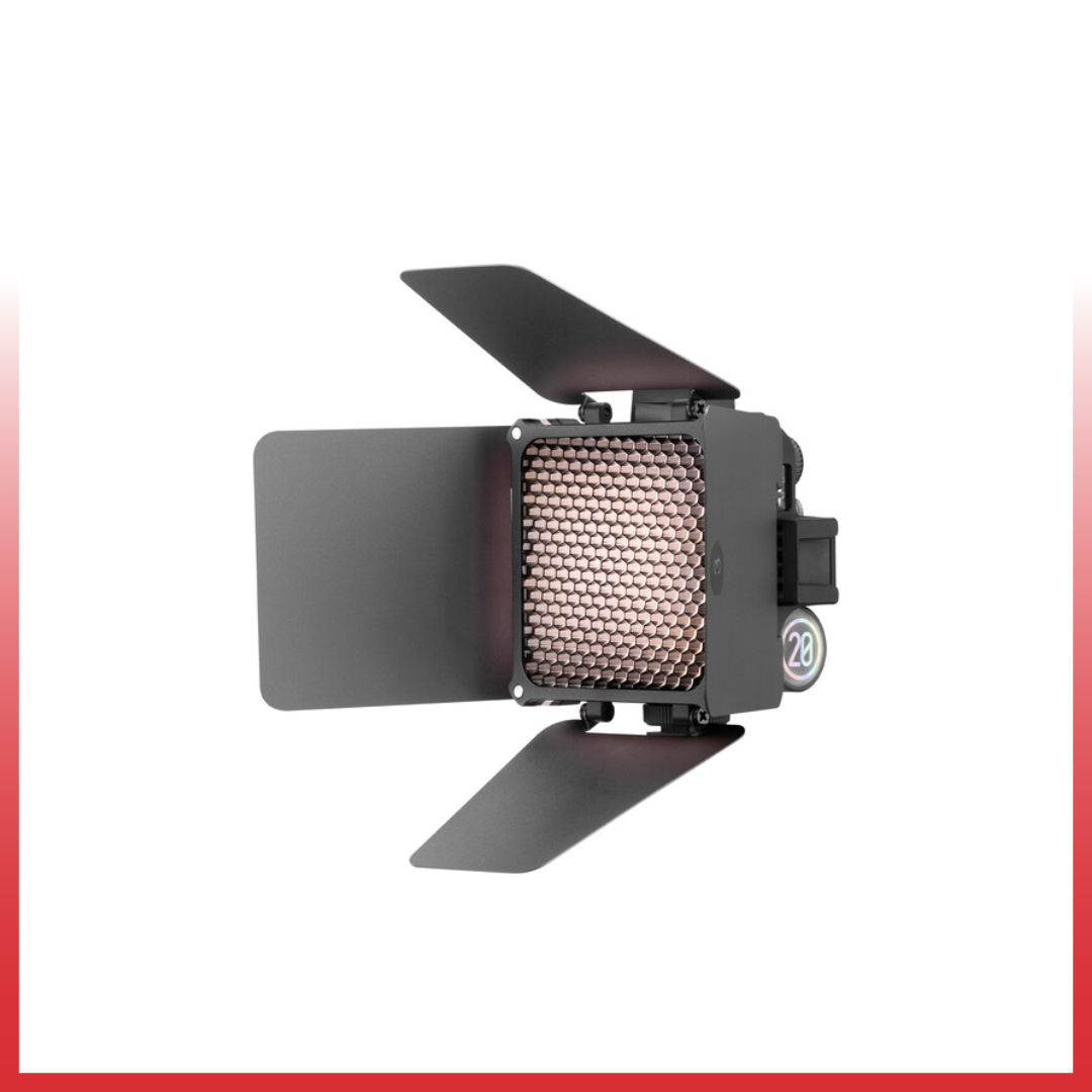 Zhiyun Fiveray M20 Bi-Color LED Light menyertakan aksesori penting untuk memodifikasi M20 sesuai kebutuhan pemotretan Anda. Kit ini dilengkapi dengan diffuser khusus, pintu gudang 4 daun, kisi-kisi sarang lebah, dan tas penyimpanan.